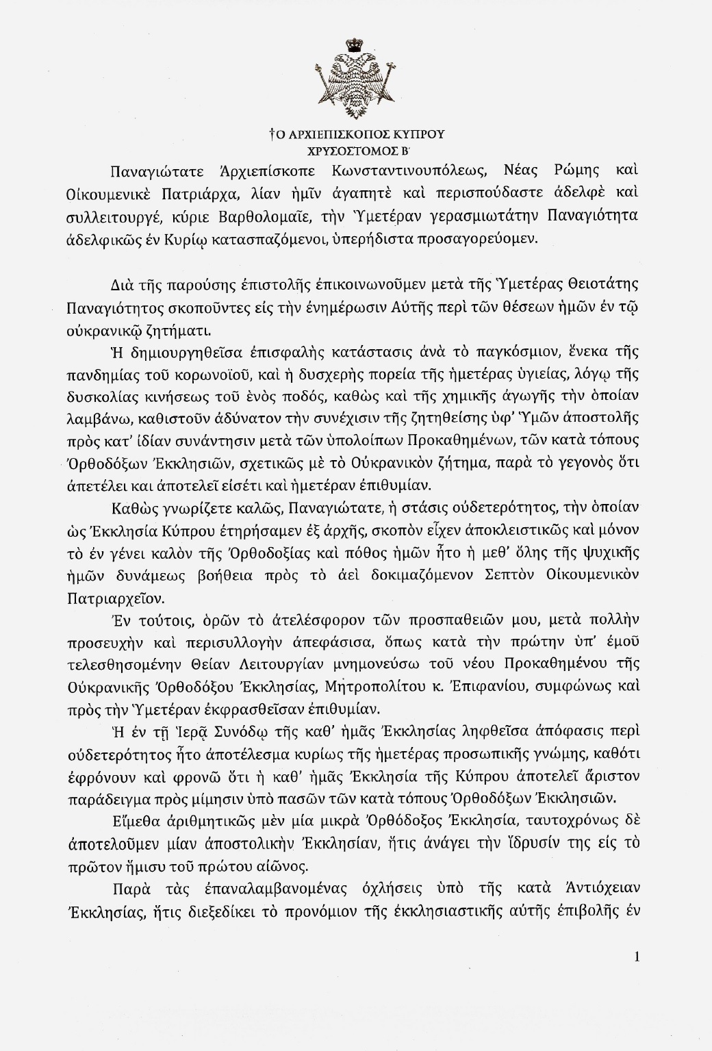Ακολουθεί η επιστολή της Αυτού Μακαριότητος του Αρχιεπισκόπου Κύπρου κ.κ. Χρυσοστόμου, προς την Α.Θ.Π. τον Οικουμενικό Πατριάρχη κ.κ. Βαρθολομαίο: