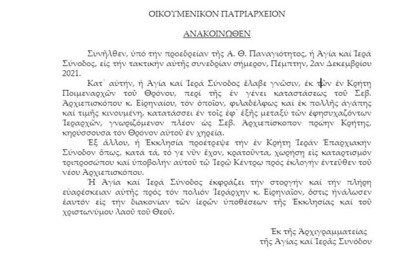 Κατ᾿ αὐτήν, ἡ Ἁγία καί Ἱερά Σύνοδος ἔλαβε γνῶσιν, ἐκ τῶν ἐν Κρήτῃ Ποιμεναρχῶν τοῦ Θρόνου, περί τῆς ἐν γένει καταστάσεως τοῦ Σεβ. Ἀρχιεπισκόπου κ. Εἰρηναίου, τόν ὁποῖον, φιλαδέλφως καί ἐκ πολλῆς ἀγάπης καί τιμῆς κινουμένη, κατατάσσει ἐν τοῖς ἐφ᾿ ἑξῆς μεταξύ τῶν ἐφησυχαζόντων Ἱεραρχῶν, γνωριζόμενον πλέον ὡς Σεβ. Ἀρχιεπίσκοπον πρώην Κρήτης, κηρύσσουσα τόν Θρόνον αὐτοῦ ἐν χηρείᾳ.